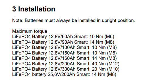 Victron Lithium Battery Manual that the batteries must be mounted upright. You can put them vertically on top of each other if the weight is being carried by a shelf and not being passed down to the battery below.